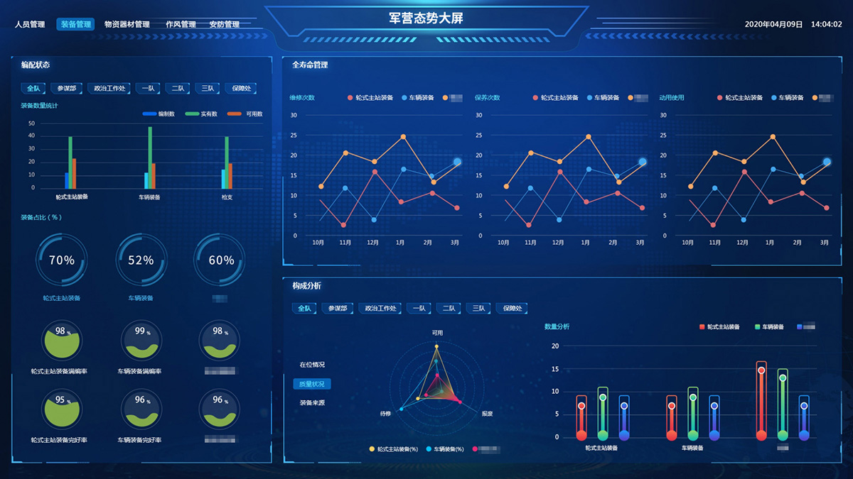 綜合保障系統(tǒng)依托物聯(lián)網(wǎng)、RFID識(shí)別和傳感技術(shù),著眼作戰(zhàn)精準(zhǔn)保障、戰(zhàn)備常態(tài)保障和官兵生活保障,對(duì)戰(zhàn)備物資、裝備器材、營(yíng)房物資和被裝物資等的全生命周期的電子化管理,對(duì)官兵的健康實(shí)時(shí)監(jiān)護(hù)。包含財(cái)務(wù)管理、軍需油運(yùn)、武器裝備、衛(wèi)勤管理、營(yíng)房管理模塊。確保部隊(duì)出動(dòng),車輛給養(yǎng)油料跟得上,裝備維護(hù)情況實(shí)時(shí)掌握,營(yíng)房管理工作平時(shí)與戰(zhàn)備同步推進(jìn)。